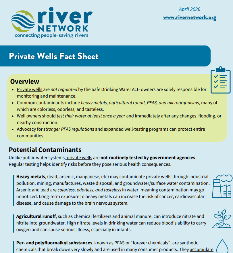 With a special guest presentation from Emily Sutton, the Executive Director and Haw Riverkeeper of the Haw River Assembly in North Carolina, and River Network’s very own intern from UNC Chapel Hill, Nancy Smart, you’ll learn about the basics of private well contamination concerns, actions private well owners can take, and how organizations can use maps, monitoring, and filtration systems to keep community members informed and safe.